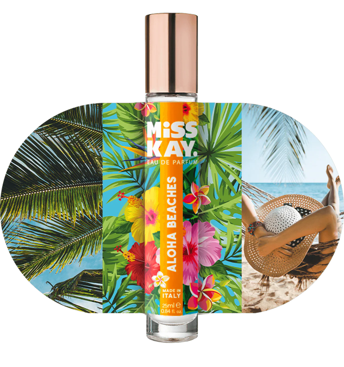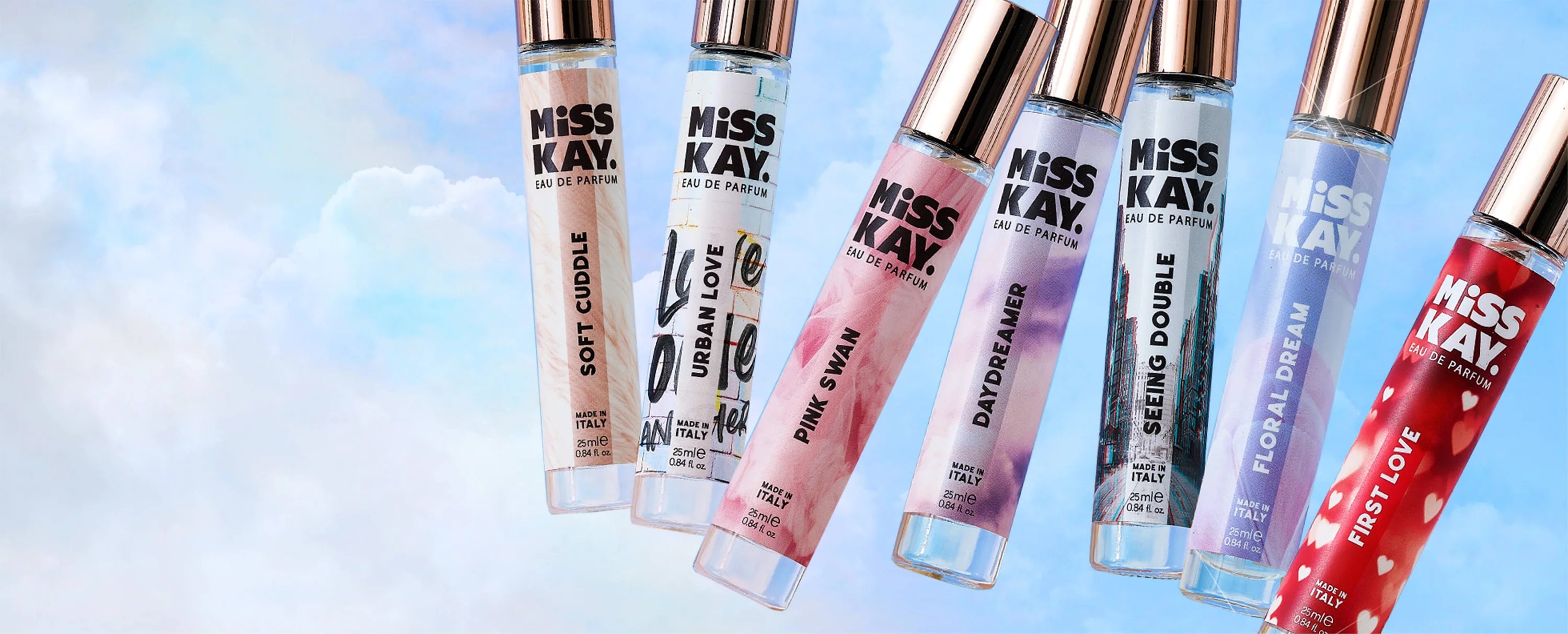 Oubliez les flacons encombrants. Les parfums Miss Kay sont proposés dans un format de poche compact de 25 ml, pour exprimer votre humeur où que vous soyez.